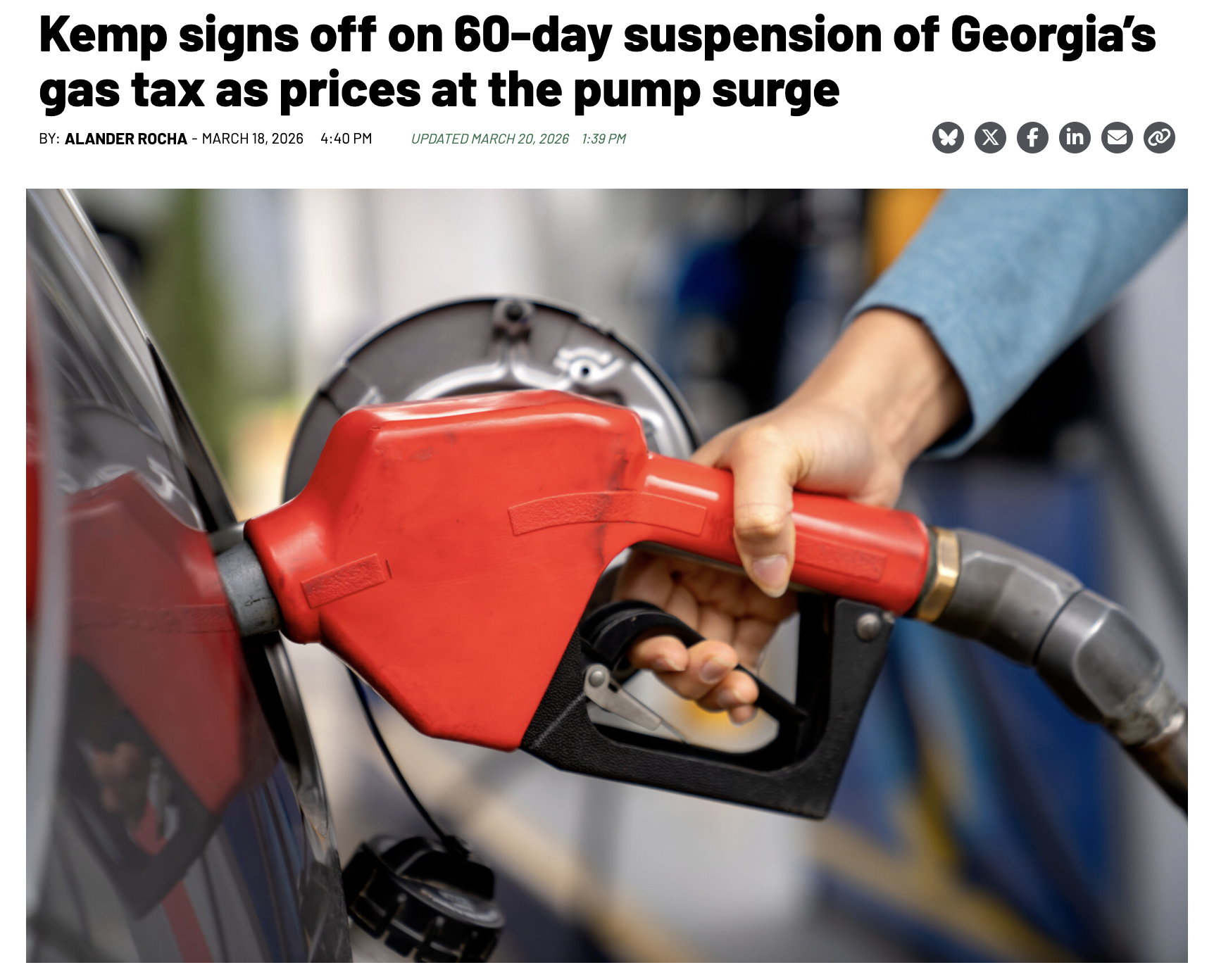 On Friday Governor Kemp signed a 60-day suspension of the state motor fuel tax to combat rising prices resulting from the war in Iran. Gas prices nationwide averaged about $3.91 Friday, up from $2.93 one month ago. This pause removes roughly 33 cents per gallon on gasoline and 37 cents on diesel here in Georgia.